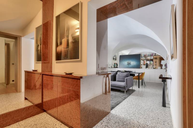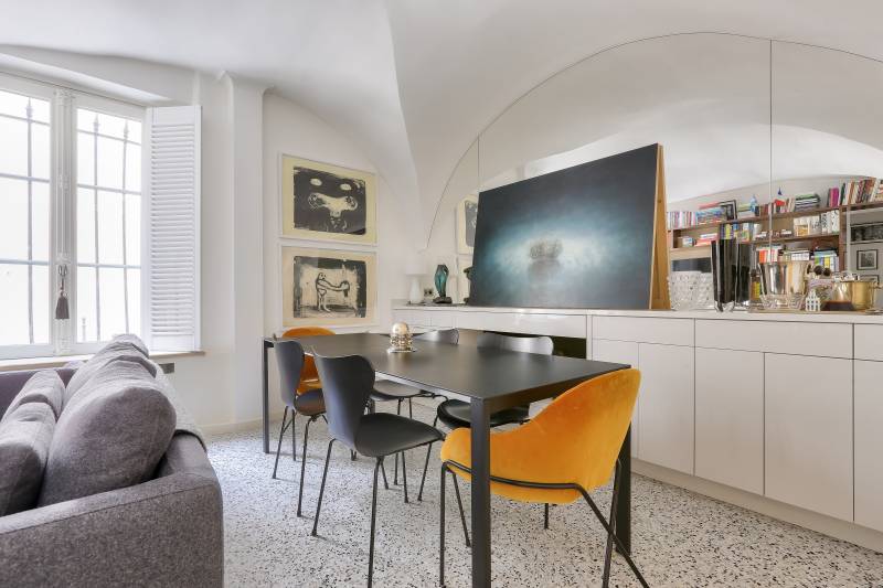 L'espace cuisine a été entièrement repensé avec la création de cloisons séparatives pour optimiser la circulation tout en conservant un aspect ouvert et aéré. Le sol a été revêtu de carreaux de Terrazzo, apportant une touche sophistiquée et contemporaine. L’agencement sur mesure de la cuisine, comprenant des meubles fabriqués spécifiquement pour cet espace, permet d’allier design et praticité. Chaque élément a été soigneusement intégré pour maximiser le rangement et offrir un cadre de vie harmonieux.